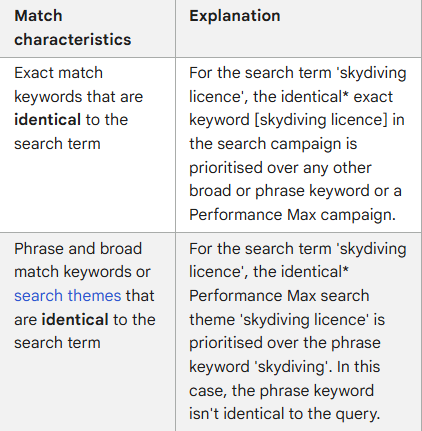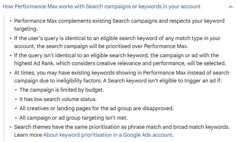 So far, this is straightforward and implies that for all search terms that are identical to keywords of any match type, your Search ad should show. For all other search terms, Google will use the campaign with the highest Ad Rank of any eligible keywords and PMax asset groups.
