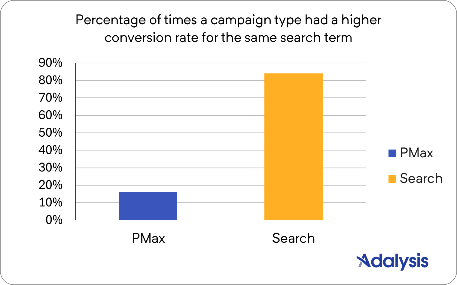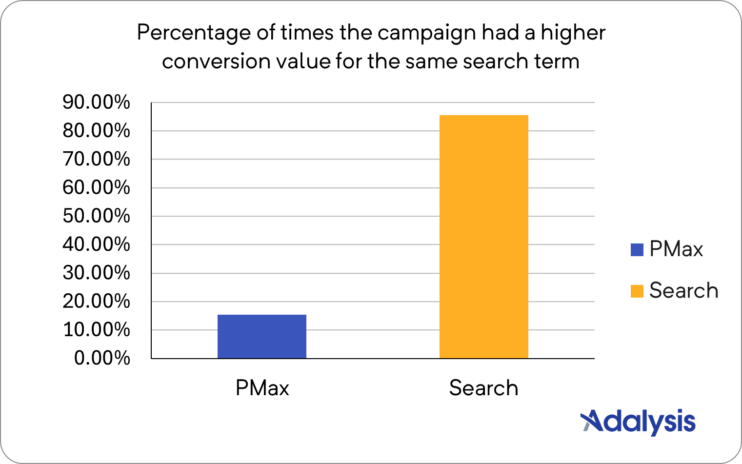 Google does not publish cost data for PMax search terms, so we can’t calculate the difference in ROAS between Search and PMax campaigns. However, we know that PMax gets more impressions than search, so we would expect PMax to have higher conversion values. In reality, Search had higher conversion values 84.62% of the time.
