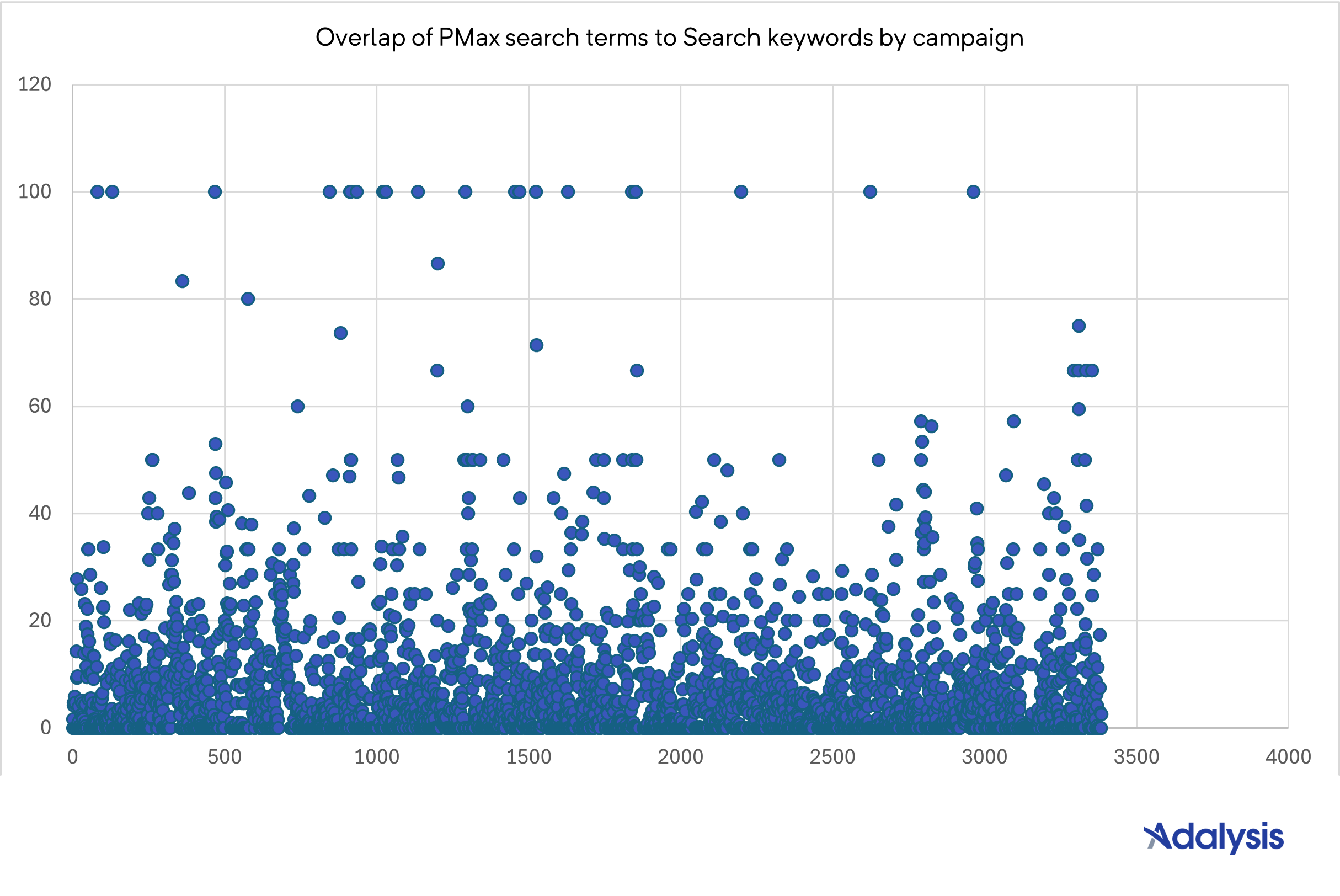 There was also a wide range of overlap. Some PMax campaigns had zero overlap, while others reached 100%. For campaigns with 100% overlap, every PMax search term was also a Search keyword.