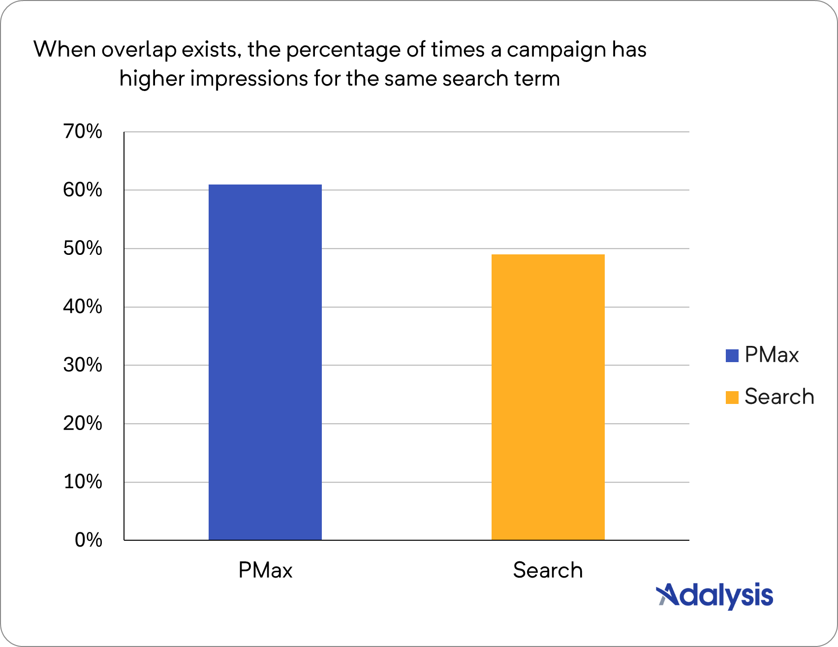 As previously noted, some accounts have no overlap issues — Search and PMax match separate search terms. When we excluded those campaigns from our analysis, PMax achieved more impressions 61% of the time.