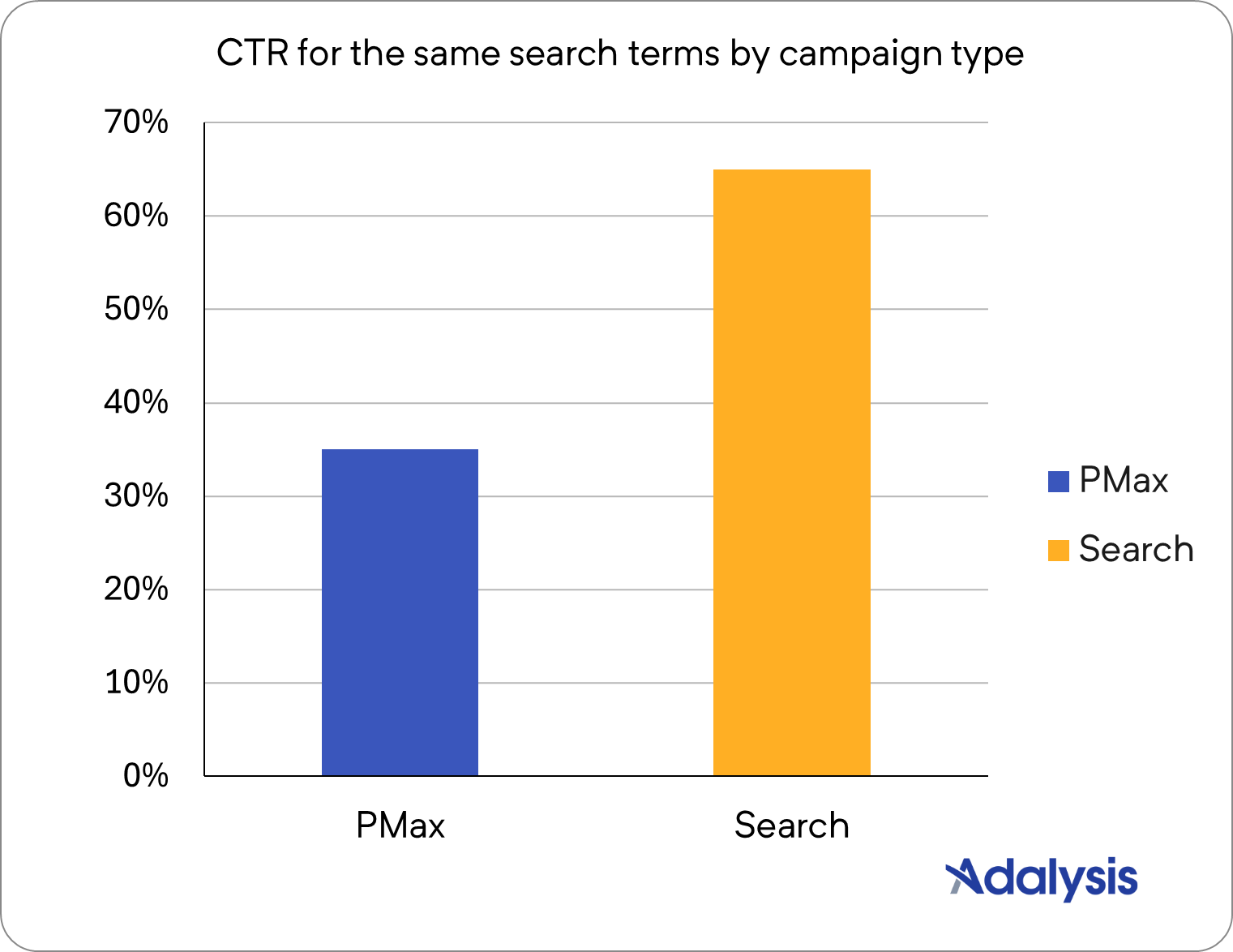For overlapping search terms, Search achieved higher CTRs 65% of the time. This makes sense. PMax assets cover a broad range of search themes and terms, while Search ads are usually written for specific keywords.