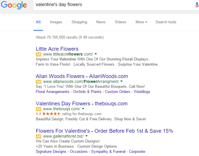 The bottom ad has been out of date for more than 2 weeks (Order before Feb 1st); and no one mentions ‘Forgot Valentine’s Day’. All the queries around ‘forgot valentine’s day’ bring up 0 ads. I’ve worked with florists in the past who really like this query as the average person conducting a search for ‘forgot’ Valentine’s spends more on flowers and gifts than someone who did their research and buying early.
