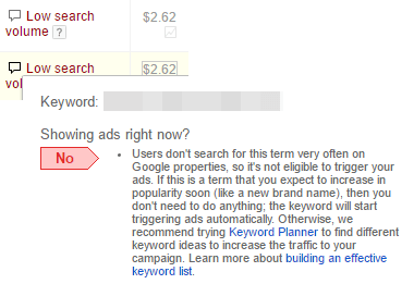 If a keyword doesn’t consistently receive roughly 35 impressions a month, it is marked as ‘low volume’ and that word won’t trigger any ads.