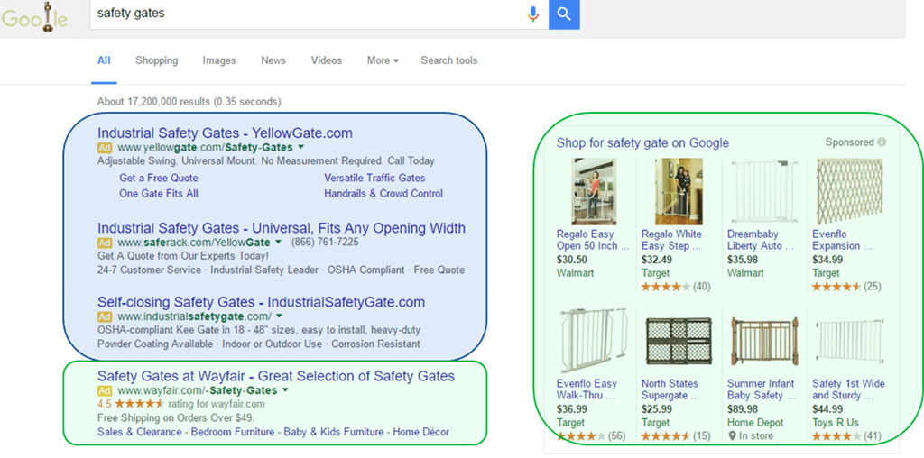 Just take a look at these ad results. The blue highlight is B2B ads and the green highlight is B2C ads.