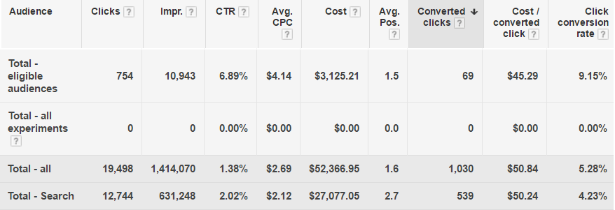 Once this site fixed the single setting; they see that users in audiences (previous visitors) convert at double those of all searchers (9.15% conversion rate for audience members and 4.23% for all search):