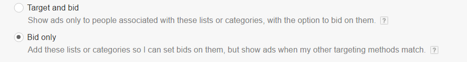 | For each audience: | Bid Only | Target & Bid | Who can see your ad? |