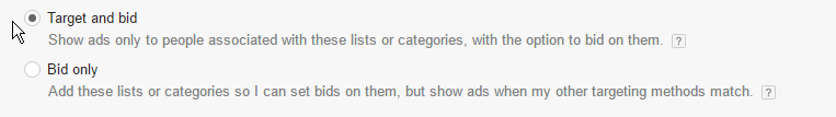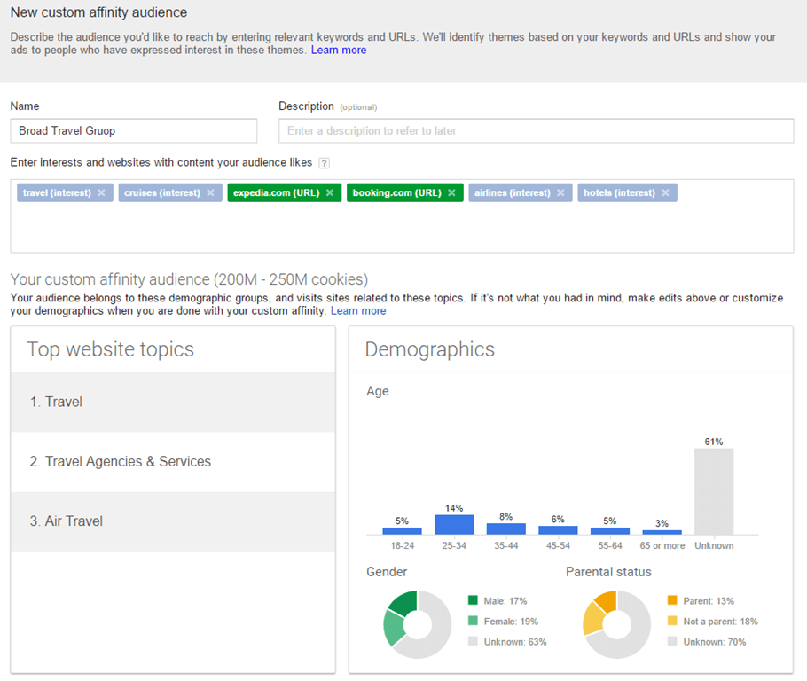 These two options allow you to build audiences (custom affinity) that have certain characteristics or find users currently in the market for a specific service or product (in-market audiences).