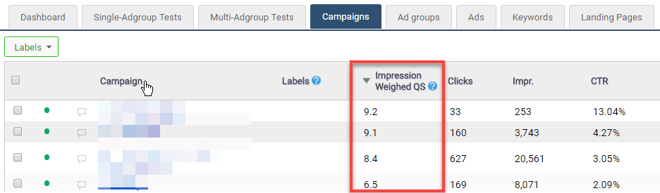 Across your campaigns and ad groups, you can easily find your impression weighted Quality Score. Using impression weighted numbers means that you won’t be fooled by a strange average. For example, if you have one keywords with a 1 Quality Score and it has 1 impression and another keyword has 10,000 impressions with a 10 Quality Score, your impression weighted Quality Score is quite high; so, you don’t want to see a misleading average of 5.5.