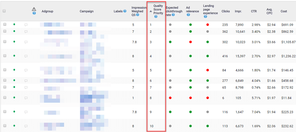 We examine the impression weighted Quality Score and your spend data and run them through an algorithm to show your exactly what ad groups need the most Quality Score assistance.