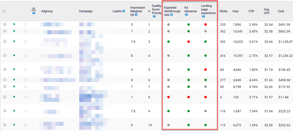 Of course, knowing what ad group needs the most help doesn’t tell you the type of help it needs. Therefore, we impression weight the sub factors of Quality Score and color code them so you can tell at a glance what you should work on for any one ad group.