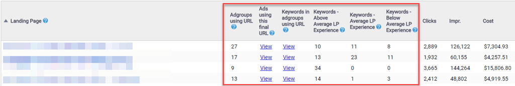 Trying to diagnose your landing pages with Quality Scores can be difficult. We show you all your landing pages used in multiple ad groups and then aggregate the Quality Score information across those pages for your account. This lets you easily see how many keywords are above, average, and below average (and the actual keywords) for these landing pages.