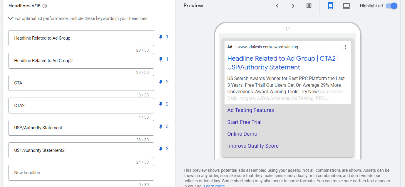 This testing method allows you to use some machine learning as you can have multiple assets for each headline, while also lowering the total combinations possible, to give the machine more data for each combination.