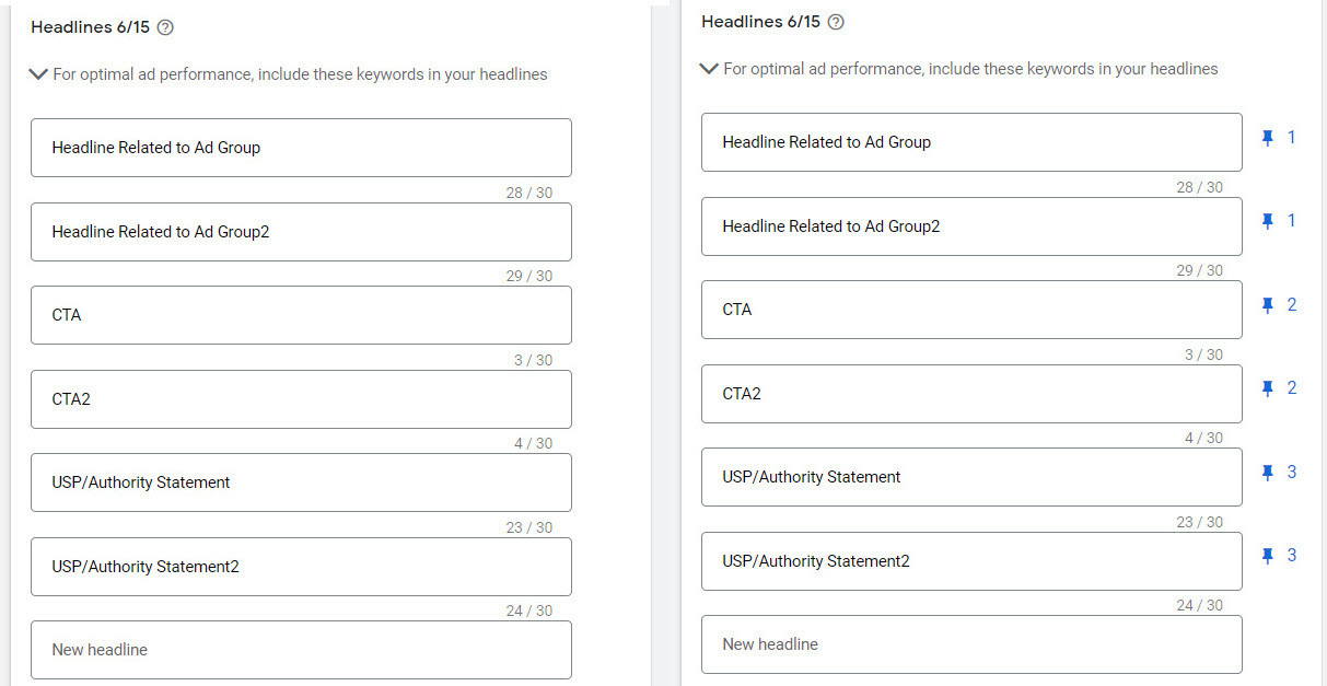 Pinning assets will lower the possible ad combinations, allowing you to have more control over how your ads are displayed and increase the data density for machine learning to understand which ad combinations are performing best in your account.