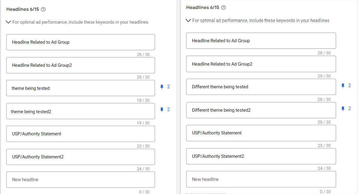 Often, each of these RSAs will have a different theme to them, such as one focusing on calls to action and another on authority statements, or one is focused on prices and another on discounts.