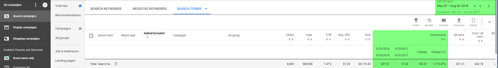 Suddenly, we can see all the search term data that had conversions or other status if we only look at the older timeframe and do not look at our data within a comparison view.