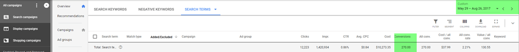 When we click to our search term data, our conversions dropped from 273 at the campaign level to 17 at the search term level.