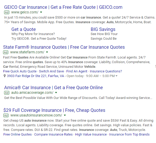 For instance, a simple search for car insurance gives us these headline 2s: