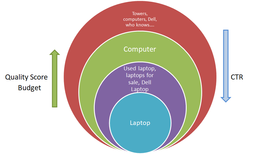 For instance, if you have the keyword laptop in your account and you have a low budget and a low Quality Score, you might only show for words like laptop, new laptop, used laptop, and some misspellings. If you have a high Quality Score, then you can start to show for terms like computer, towers, Samsung computer, and more.