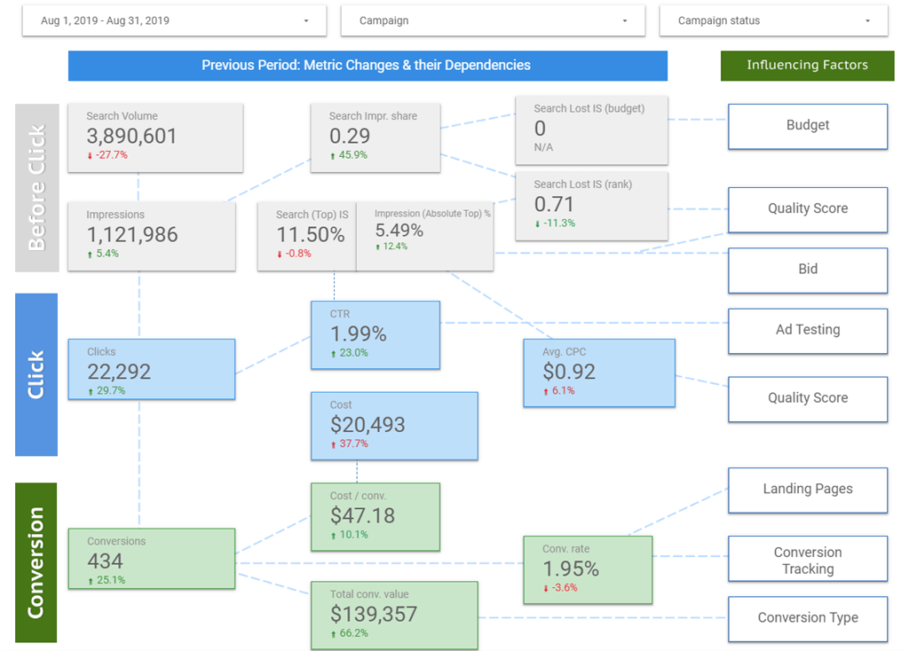 If you’re not familiar with this template, it’s the easiest way to tell data driven PPC stories by just glancing at a metric comparison.