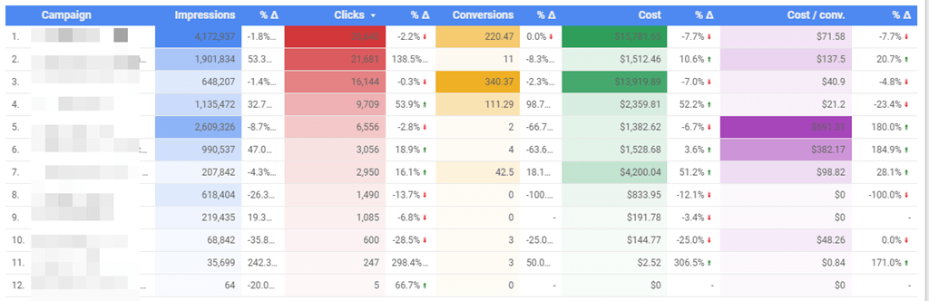 You can see this data for the Performance Analyzer or for your campaign data to find the most significant changes so you can examine the performance data for a single campaign.