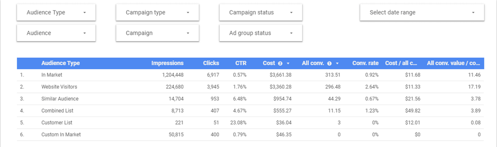 The audience drill down page is handy once you know how to work with drill downs. It starts by looking at audience type and then you can drill down into the audience name, campaign, and ad group data.