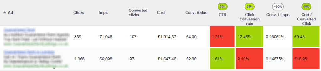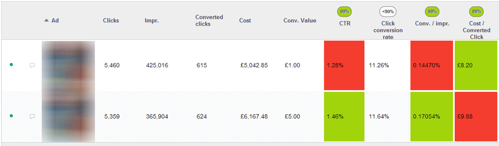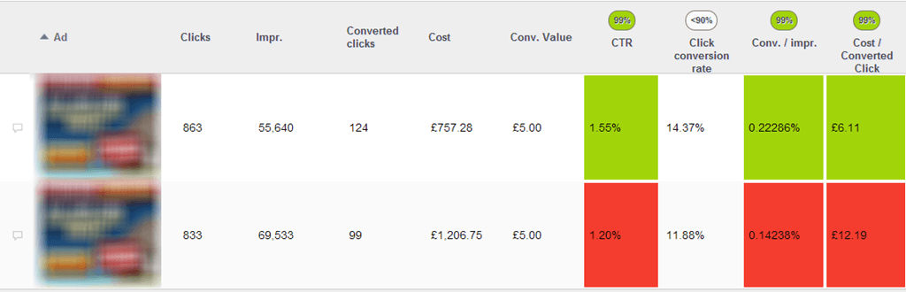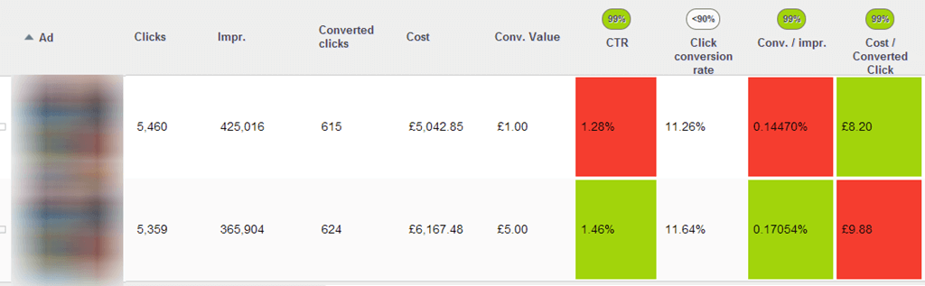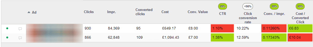 If our target CPA was £10 and our goal was the most leads; then the 2nd ad would be our winner as it has the higher CPI (conv. impr) and is still below the target cost.