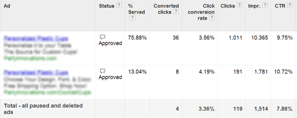 For instance, if the campaign had the ad rotation setting set to ‘Optimize for conversions’ and we examine a time frame where all the ads were active, we would expect to see that the highest ad percentage served would be the ad with the highest conversion rate.