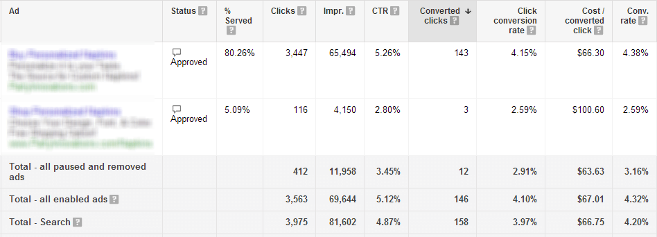 Unfortunately, that is not always true. Sometimes AdWords makes decisions too quickly and the wrong ad has the highest ad served percentage. For example, the below campaign was set to ‘Optimize for conversions’. Ad two is the highest converting ad and has the highest click through rate; so by any ad rotation standards the second ad should have the highest percentage served. However, it does not.