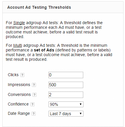 As clicks only happen when an ad actually receives clicks, this is also a minimum that you don’t want to set very high as a single low CTR ad can take a lot longer to achieve the minimum data necessary. Often with conversion rate testing, minimum clicks are not necessary to set at all. Please note, if you are testing landing pages, then you would want to set some threshold to ensure that each page did receive a minimum number of visits.