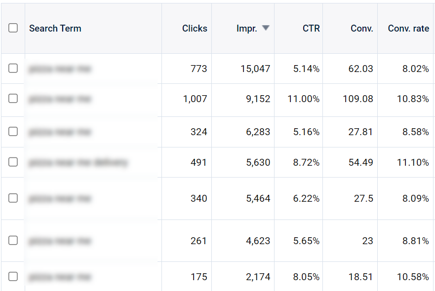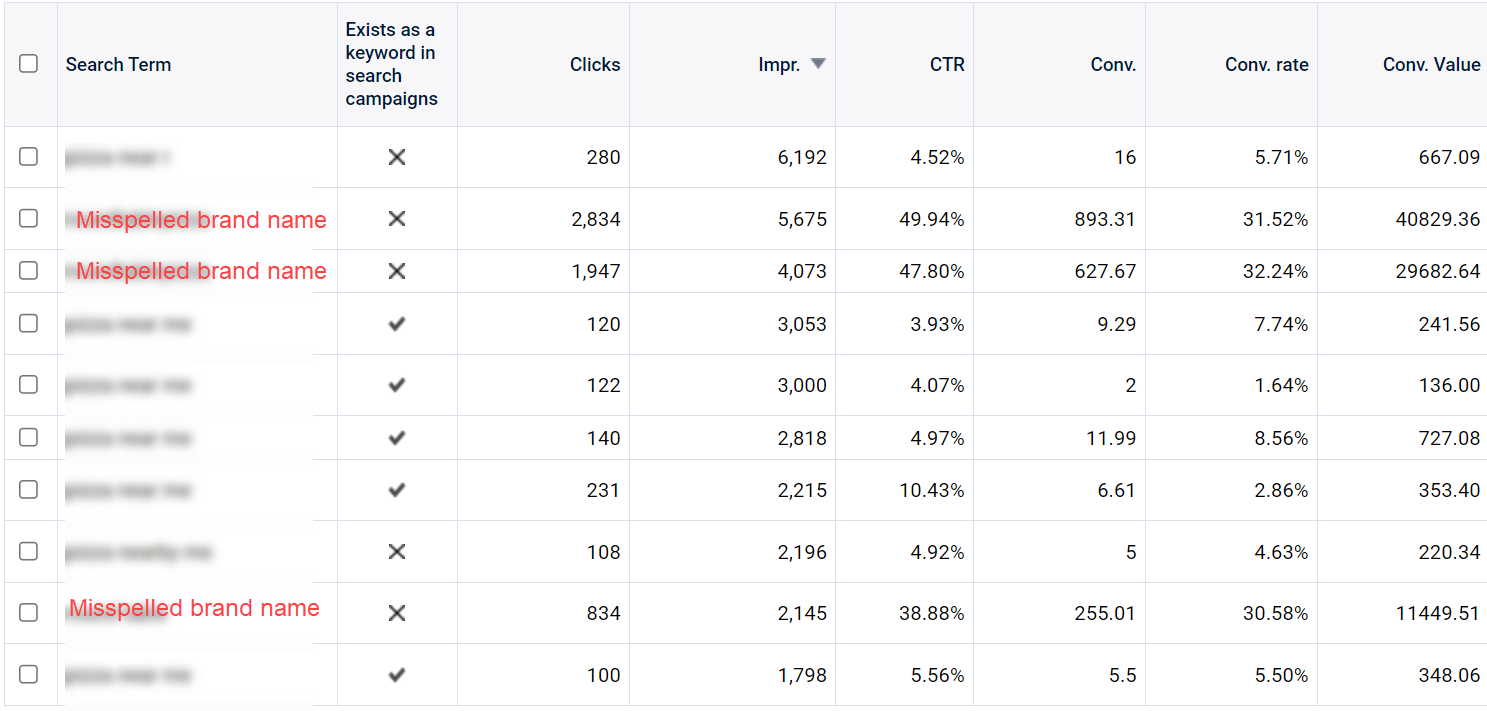 First, the very high conversion rate terms are misspellings of their brand name. While Google says that they first correct for misspellings, that did not happen in this case. To be fair, it looks like someone was trying to type in the URL. For example, if (it was not) the brand term was Little Caesars Pizza, the search term was littlecaesarspizza. This account needed to expand its brand exclusions from PMax.